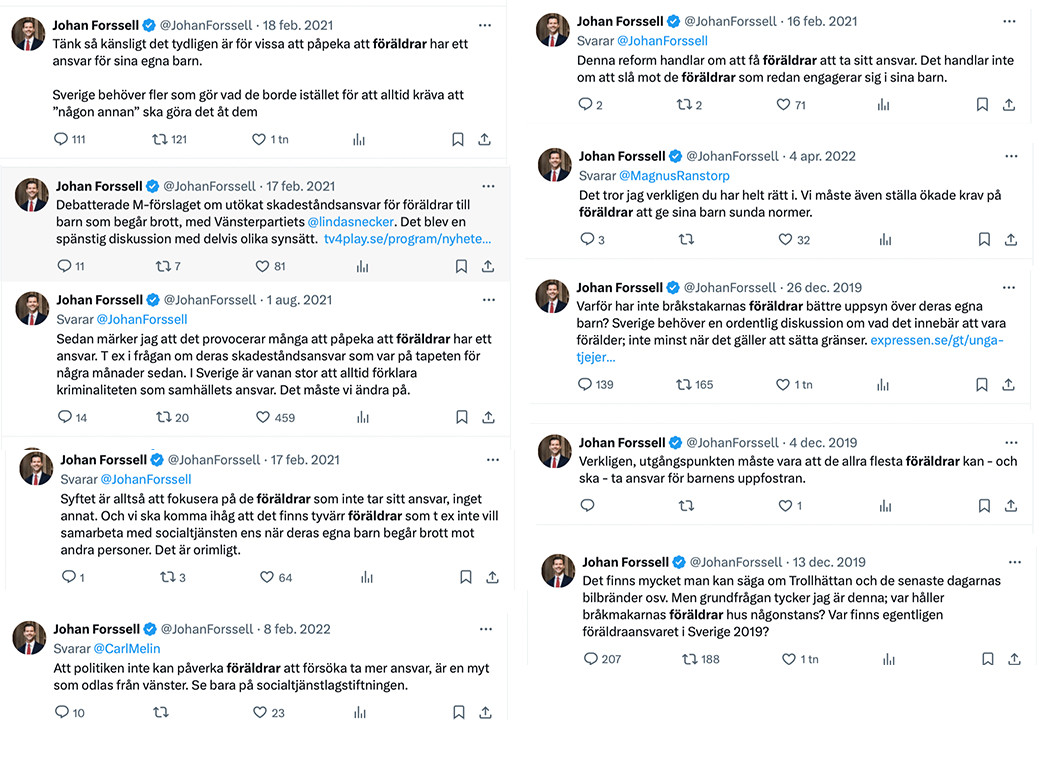 Mest slående med allt detta är dock hur uppgiften – om den stämmer – ställer sig mot Forsells och hans kollegors tendens att ta till brösttonerna när det kommer till föräldrars ansvar för att uppfostra sina barn till goda medborgare. Det är nämligen något de pratar mycket om, och som återspeglas i deras många åtgärder för att straffa föräldrar till gängkriminella barn.