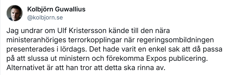 Istället tycks kontakterna med berörda innan publicering bara ha lett till att konton doldes, inga kommentarer gavs, och att Ulf Kristersson – två dagar senare – presenterade regeringsbildningen precis som planerat. Som journalisten Kolbjörn Guwallius påpekar i ett inlägg på Bluesky, är det anmärkningsvärt (vi vet alltså nu att regeringen kände till detta på förhand):