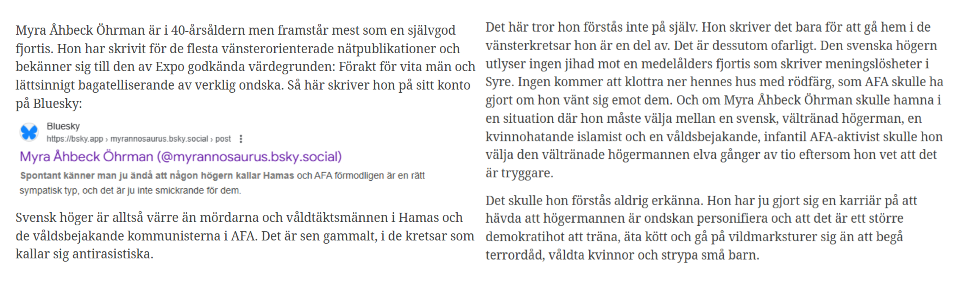 Assarmo citerar ett inlägg med sju likes från Bluesky (som av en händelse verkar ha skärmdumpats direkt från googleresultateten, och är ett av toppresultaten som kommer upp när man googlar mitt namn + Hamas) där jag ironiserar över svensk högers användning av “Hamas” och “AFA” som generella skällsord. Mitt inlägg löd: