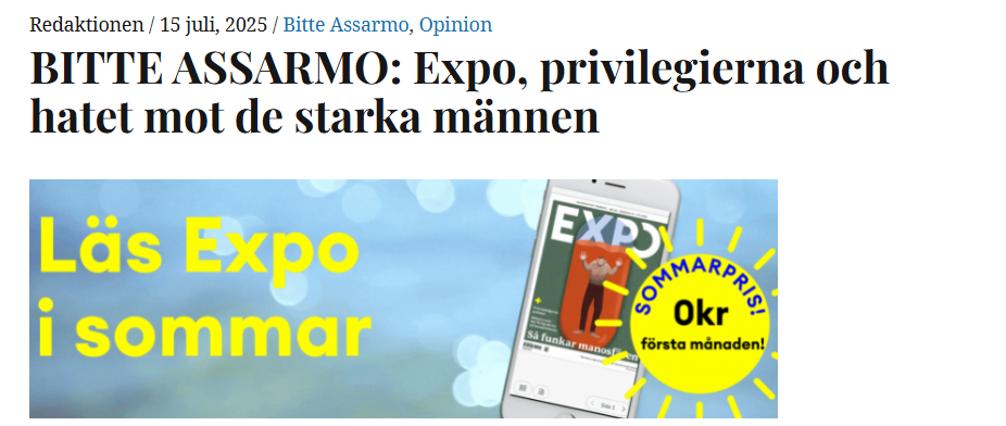 Men kanske är det just därför hon inte citerade den. Eller ens bemödade sig att läsa den, trots att hon bildsatte sin text med en skärmdump på Expos egen reklambanner som informerar om att prenumerationer är gratis under sommaren. Jag börjar nästan förstå varför Bitte tycker att det är så viktigt att vi värnar om starka män, när det här är nivån på hennes lättja.