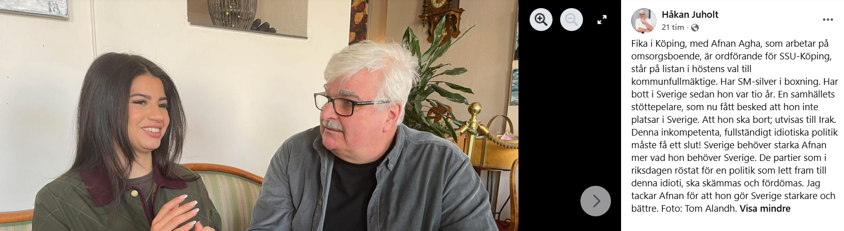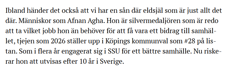 I veckan publicerades ett reportage i Dagens Nyheter om Afnan Agha, en 21-årig tjej från Köping som riskerar att utvisas till Irak. Att hotas med utvisning trots att hon bott i Sverige sedan hon var åtta år gammal är hon tyvärr inte ensam om. Vad som däremot gör henne unik är att hon sedan tre år tillbaka varit ordförande för sin lokala SSU-förening.